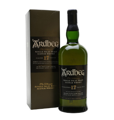 A litre bottle of Ardbeg 17 Year Old. A tad less peaty than early bottlings, this is still a great whisky, but is sadly becoming very thin on the ground as demand increases and supply runs low - it's now a good few years since owners Glenmorangie discontinued it. The first bottling of this sparked the revival of Ardbeg's fortunes after the takeover by Glenmorangie.
