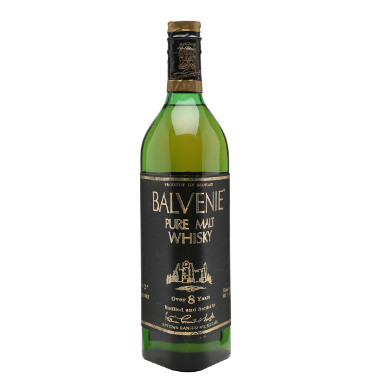 A 1970s bottle of Balvenie 8 year old, with a rather grand black leather label on its very Glenfiddich-esque bottle.