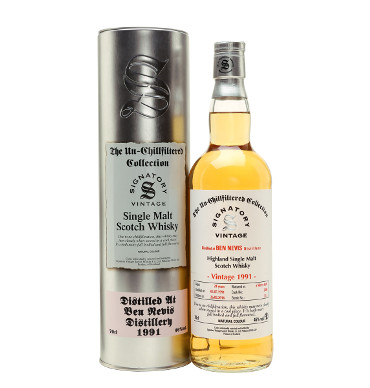 A 24-year-old-Signatory bottled whisky from Ben Nevis distillery in the Highlands of Scotland. This has been bottled without chill-filtration after maturing in a sherry butt - distilled on 29 October 1991 and bottled on 5 October 2016. Ben Nevis whiskies are known for their notes of vanilla and honey.
