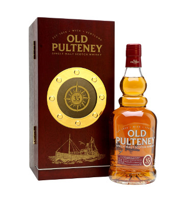 A 2014 release, Old Pulteney's 35 Year Old is a combination of ex-bourbon American oak and ex-sherry Spanish oak casks, resulting in a rich and indulgent whisky. The box has been created to reflect the distillery's maritime heritage and contains a porthole through which the bottle is visible.